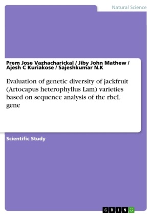 Scientific Study from the year 2016 in the subject Biology - Genetics / Gene Technology, Mar Augusthinose College, language: English, abstract: Jackfruit (Artocarpus heterophyllus) is commonly grown in home gardens of tropical and sub-tropical countries. The fruit contains high levels of carbohydrates, protein, starch, calcium and vitamins. Jack fruit has diverse medicinal uses, especially anti-oxidant, anti-inflammatory, anti-microbial, anti-cancer and anti-fungal activity. Jackfruit is considered to be an underutilized fruit where most of the fruits get wasted due to ignorance, lack of post harvest technology and gaps in supply chain systems.Jackfruit contains more protein, calcium, iron, vitamins and other essential nutrients as compared to the common fruits. To find out the morphological variation among jack fruits among Kerala we conducted an elaborative survey and found out the parameters such as tree characteristics, leaf characterises or fruit characteristics of selected samples.Both qualitative and quantitative data are measured using field visits and standard methods and morphological indicators; after analysis of data there is a morphological variation among the jack fruit samples identified. Advances in the genetic markers such as RFLP and PCR based methods are more reliable for identification of genetic diversity than morphological markers although each technique has advantages and limitations.The objective of this research work was to estimate the level of genetic diversity and to assess genetic relationships among six varieties of jackfruit using the 'rbcL gene' based on PCR technique and RFLP markers. The partial sequence of 'rbcL' gene of six different Artocarpus varieties was used in the analysis. The size of amplified products was approximately 700 bp. After sequencing and sequence editing, sequence information on a 651 bp region was finally obtained for analysis. The alignment of sequences revealed two haplotypes out of 651 sites. The nucleotide frequencies are 27.96% (A), 29.47% (T/U), 19.69% (C), and 22.89% (G). Being one of the underutilized fruits in India, Artocarpus heterophyllus Lam has promising leads to further scientific research and livelihood strategies. The study of rbcL gene using PCR and RFLP seems to be a promising tool in establishing genetic diversity among jackfruit varieties.