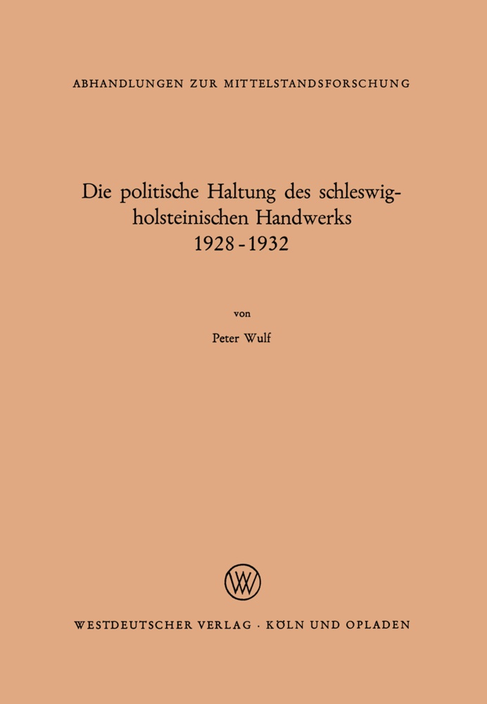 1. Gegenstand und Methode.- 2. Quellen und Quellendiskussion.- I. Kapitel: Die Organisationen des Handwerks.- 1. Der Reichsverband des deutschen Handwerks.- 2. Der Nordwestdeutsche Handwerkerbund.- 3. Der Landesverband und die Kreishandwerkerbünde.- 4. Die Handwerkskammern.- II. Kapitel: Die politische Haltung des schleswig-holsteinischen Handwerks 1918-1928.- 1. Die Anfänge der Handwerkerbewegung in Schleswig-Holstein und die Wahlen von 1919 und 1921.- 2. Das Handwerk und die Reichs- und Landtagswahlen 1924.- III. Kapitel: Der Beginn der Weltwirtschaftskrise und die Wendung zu den berufsständischen Parteien 1928/29.- 1. Die allgemeine Entwicklung.- 2. Die wirtschaftliche Lage des Handwerks 1928/29 und der Beginn der Weltwirtschaftskrise.- 3. Das Handwerk und die Parteien 1928/29.- 4. Handwerk und Landwirtschaft im Januar und Februar 1928.- 5. Die Wahlen zum Reichstag und Landtag im Mai 1928.- 6. Die Versammlungen des Mittelstandes und des Landvolks im Frühjahr 1929.- 7. Die Kommunalwahlen vom November 1929.- IV. Kapitel: Die Entwicklung der Weltwirtschaftskrise und die politische Radikalisierung 1930/1931.- 1. Zeitbewußtsein und Krisenbewußtsein.- 2. Der Verlauf der Wirtschaftskrise und die wirtschaftliche Lage 1930/1931.- 3. Nationalsozialismus und Mittelstand.- 4. Die Reichstagswahlen vom September 1930.- 5. Die Entwicklung im Landesverband vom März 1930 - Oktober 1931.- V. Kapitel: Der Höhepunkt der Weltwirtschaftskrise und der Sieg des Nationalsozialismus 1931/1932.- 1. Das Handwerk und der berufsständische Gedanke.- 2. Der Höhepunkt der Weltwirtschaftskrise und die wirtschaftliche Lage 1932.- 3. Die Notgemeinschaften der Landwirtschaft und des Mittelstandes 1931/1932.- 4. Die Entwicklung im Landesverband vom Oktober 1931 bis Februar 1932.- 5. DieReichspräsidentenwahl und die preußischen Landtagswahlen vom Frühjahr 1932.- 6. Die Reichstagswahlen vom Juli und November 1932.- Schlußbetrachtung.- Beilagen.- 1. Karten.- 2. Tabellen.