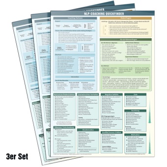 Alle NLP-Produkte gibt es jetzt auch als DIN A2 Poster zum Aufhängen+++++++++++++++++++++++++++++++++++++++++++++++++++++++++++++++++Inhalt des Sets sind 3 gleiche Ausgaben des NLP Coaching QuickfindersSie sparen beim Kauf des Sets gegenüber dem Einzelpreis für die Wissenskarten! Die Beschreibungen im Einzelnen: NLP Coaching Quickfinder (Wissenskarte)Hier wird der NLP COACHING QUICKFINDER im Video vorgestellt: https://www.youtube.com/watch?v=3hez0ZNrRV0Sind Sie NLP Coach, NLP Master oder Practitioner? Wer kann schon alles Gelernte im Kopf behalten? Der NLP COACHING QUICKFINDER bietet für jedes NLP Coaching eine schnelle Übersicht über die wichtigsten NLP Techniken und Formate und ist eine wesentliche Gedankenstütze für den NLP Coach.Das Arbeiten mit dem Quickfinder macht Spaß und erinnert den Coach an wichtige Fragen, Abfolgen und Interventionen.Er ist hochwertig laminiert und somit sehr strapazierfähig.Lassen Sie sich schnell erinnern an: Ausführliche Sequenz des Coaching-Rahmens - 7 Auftrags- und Zielfragen + SMART Wohlgeformtheit - 8 x Ökologiefragen - 3 x Interventionen für Test & Manifestation (Convincer, Future Pace, Erster Schritt) - 6 x wichtige Skalenfragen für Erfolgsmessung und Ressourcenaufbau - 17x Rahmenfragen (Lösungsrahmen, Als-Ob-Rahmen, Stellvertreter-Rahmen, Experiment-Rahmen, Fee-Rahmen, Wunderfrage) - - Logische Ebenen (Zeichnung) - - Liste typischer Submodalitäten (visuell, auditiv, kinästhetisch) - Kurzbeschreibung der 6 Ankertechniken + TIGER-Model - 14 x Sleight of Mouth Sprachmuster gegen Glaubenssätze mit Beschreibung und Beispiel - - 1 x einfache Hypnose-Induktion zum Vorlesen Gruppierung von 40 Interventionen nach geschätzter Dauer Besonders nützlich: verschiedene Veränderungsbereiche des Klienten mit ca. 40 zugeordneten passend sortierten Interventionen. Die Bereiche sind: - Ressourcen-Aufbau - Unerwünschtes Verhalten - Negative Gefühle - Ziele - Motivation - Beziehung - Innerer Kritiker - Glaubenssätze - Entscheidungen++++++++++++++++++++++++++++++++++++++++++++++++++++++++++++++Lust auf mehr Inspiration und Wissen?Hoher Nutzen auf wenig Raum: Alle unsere Wissenskarten und Poster sind immer:- verständlich - kompakt - übersichtlich - praxisnah - alltagstauglich - zeitsparend - spickzettelmäßig und langlebig durch 500 micron Laminierung. Mehr spannende Lern- und Wissenskarten sowie Posterzu vielen aktuellen Themen finden Sie auf unserer Homepage www.futurepacemedia.de