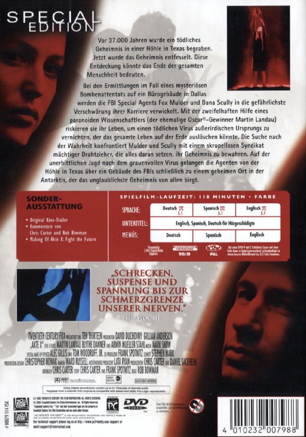 Gute Story mit der Vertuschungsaktion (was ja im realen Leben auch gemacht wird), tolle Schauspieler und gute Special-Effekts machen den Film zu einem guten Werk. Für Akte-X-Fans sowieso ein Muss, aber kann problemlos auch von allen anderen angeschaut werden. Gillian sieht echt Klasse aus! -