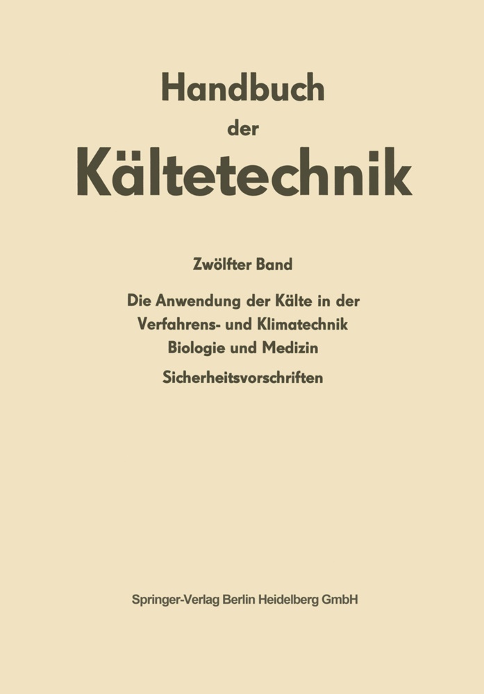 Die Kälte in der chemischen Verfahrenstechnik.- Die Kälte in der mechanischen Fertigung.- Die Kälte im Laboratorium und in der naturwissenschaftlichen Forschung.- Die Kunsteisbahnen.- Das Gefrierverfahren im Schacht-, Grund- und Tunnelbau.- Kühlung von Beton bei Staumauern.- Seetransport von Flüssiggas.- Entwurfsgrundlagen von Klimaanlagen.- Klimatisierung von Kühlräumen.- Klimatisierung von Hochhäusern.- Klimaanlagen in Eisenbahn-Personenwagen.- Klimatisierung von Bergwerken.- Dritter Teil Die Anwendung der Kälte in der Biologie und Medizin.- Sicherheitstechnische Maßnahmen für den Bau, die Aufstellung und den Betrieb maschineller Kälteanlagen.- Namenverzeichnis.