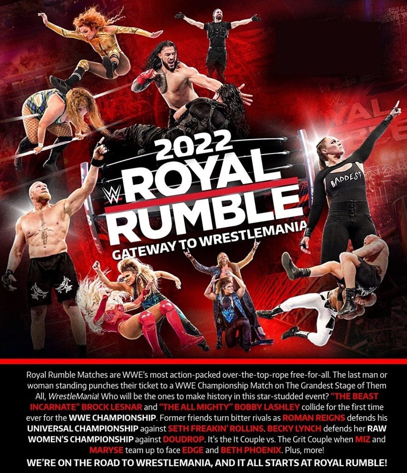 Royal Rumble Matches are WWE’s most action-packed over-the-top free-for-all. The last man or women standing punches their ticket to a WWE Championship Match on The Grandest Stage of Them All, WrestleMania! Who will be the ones to make history in the star-studded event? ‘THE BEAST INCARNATE’ BROCK LESNAR and ‘THE ALL MIGHTY’ BOBBY LASHLEY collide for the first time ever for the WWE CHAMPIONSHIP. Former friends turn bitter rivals as ROMAN REIGNS defends his UNIVERSAL CHAMPIONSHIP against SETH FREAKIN’ ROLLINS. BECKY LYNCH defends her RAW WOMEN’S CHAMPIONSHIP against DOUDROP. It’s the It Couple vs. The Grit Couple when MIZ and MARYSE team up to face EDGE and BETH PHEONIX. PLUS, more!