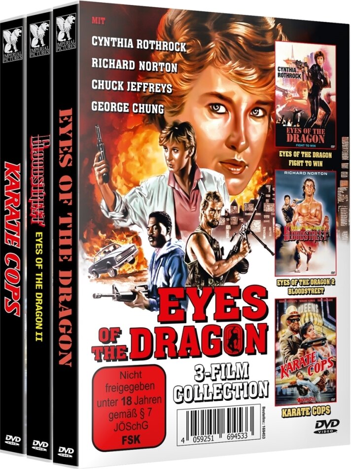 EYES OF THE DRAGON (1985) Unzensierte Integral-Langfassung! - 15 Minuten längere Uncut-Fassung komplett in deutscher Sprache! - Der grosse 80er-Jahre Martial Arts-Klassiker mit CYNTHIA ROTHROCK und RICHARD NORTON - Regie: Grossmeister LEO FONG (1928-2022), der Mann der BRUCE LEE trainierte! Handlung: Der hitzköpfige Ryan, gelehriger Schüler seines Karatemeisters, verliert in einem vorschnell eingegangenen Wettkampf eine wertvolle Statuette gegen einen ausgefuchsten Herausforderer Armstrong. Weil sein Meister einen Herzanfall erleidet, wird Ryan von einem neuen Trainer - zu seiner Überraschung eine Frau - auf den Revanchekampf vorbereitet, und das so gut, dass er ihn eindrucksvoll gewinnt. Als darauf Armstrong die Herausgabe der Statuette verweigert, kommt es zum tödlichen Showdown... BLOODSTREET - EYES OF THE DRAGON II (1987) Joe Wong (LEO FONG), ein skrupelloser Privatdetektiv, bekommt von einer attraktiven Frau den Auftrag, ihren Ehemann wieder zu finden. Ein scheinbar alltäglicher, harmloser Job - doch schon bald gerät er ins Kreuzfeuer von zwei brutalen Gangstern, deren einziges Interesse dem Drogenhandel und den blutigen Machtkämpfen gilt. Joe Wong setzt alle Waffen gegen die Übermacht der Unterwelt ein. Schrotflinten und seine Fäuste, vor allem aber eine perfekte Karatetechnik sind seine Stärke. Er kämpft um auf der "Bloodstreet" von San Francisco zu überleben. KARATE COPS - EYES OF THE DRAGON III (1988) Hawkeye, ein Polizist aus Las Vegas, kennt keine Gnade im Kampf um Gerechtigkeit und Ordnung. Zusammen mit dem "Superbullen" Charles Wilson verfolgt er nur ein Ziel - den brutalen Mord an seinem Jugendfreund aufklären. In einer Welt von Gewalt und Prostitution, in der Macht mehr bedeutet als ein Menschenleben, kämpfen sie im grellen Neonlicht von las Vegas gegen Korruption von Regierung, Mafia und Yakuza. Ihre härtesten Waffen sind dabei ihre knallharten Fäuste...