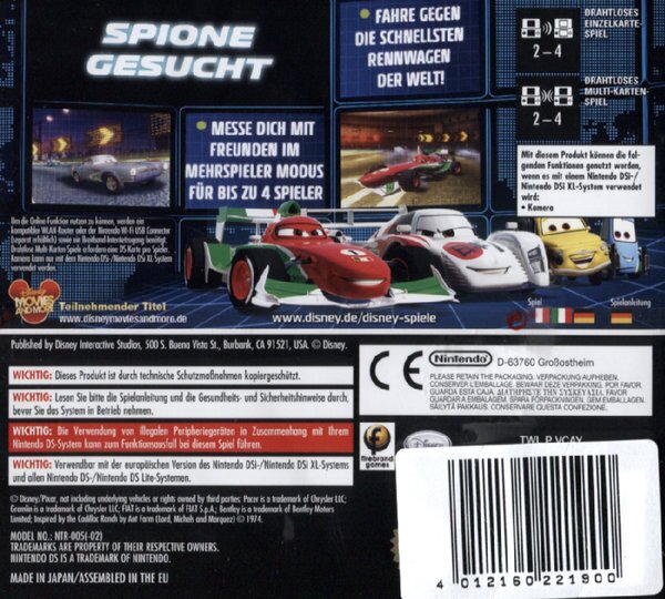 Cars 2 - Das Videospiel basiert auf dem Disney/Pixar Animationsstreifen und entführt die Spieler ins Cars 2-Universum, wo sie mit beliebten Cars-Charakteren aufregende Schauplätze rund um den Globus besuchen. Passend zur Filmhandlung stehen Hook, Lightning McQueen sowie einige brandneue Charaktere zur Auswahl, die im internationalen Spionage-Ausbildungszentrum CHROM (Computergestütztes Hauptquartier der Regierung für Operative Motorspionage) zu Weltklasse-Agenten gedrillt werden sollen. Die Spieler bestreiten gefährliche Missionen, Wettrennen um den Titel "Schnellstes Auto der Welt" und setzen in spannenden, actionreichen Kampf-Rennen ihre Agenten-Fähigkeiten ein. Sowohl im Einzel- als auch im Mehrspielermodus können bis zu vier Mitspieler gegeneinander antreten und anspruchsvolle neue Strecken, coole Charaktere und Events und packende Spionage-Missionen freischalten.