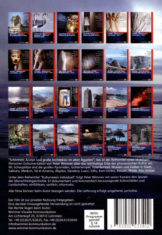 Eine filmische Dokumentation im Breitbildformat, aus der Reihe "Kulturreisen individuell". Go West, so könnte ich meine Reiseroute in diesen Wochen beschreiben. Die Randlandschaften Großbritanniens bieten dem Reisenden Erlebnisse und Eindrücke, die er in dieser Dichte und Vielfältigkeit nirgendwo sonst auf der Insel findet. Clovelly, eines der wenigen englischen Fischerdörfer in Privatbesitz, ist heute ein Museumsdorf ganz besonderer Prägung. Als Transportmittel dienen noch immer Esel und Schlitten. Im Exmoor leben Rotwild, Schafe und Ponys ohne Zäune. 800 km Wanderwege sind ausgewiesen. Tarr Steps ist mit 55 Meter die längste Clapper Bridge der Insel. Wells ist eine Kleinstadt mit großer Geschichte, eine Kathedralenstadt mit einem festungsgleichen Bischofs-palast aus dem 13. und 14. Jh. Die Kathedrale von Wells gilt als Glanzlicht früher Gotik in England. Das Innere sprengt alle architektonischen und gestalterischen Gesetzmäßigkeiten. Nie zuvor ist der Spitzbogen so konsequent in die Gesamtarchitektur integriert worden. Die Mondphasenuhr aus dem Jahre 1390 ist ein Meisterwerk der Uhrentechnik. Während vier Ritter hoch zu Ross in Kreisform einander jagen, schlägt der berühmte Quarter Jack die Glocke. Wookey Hole ist eine Tropfsteinhöhle, rund sechzigtausend Jahre alt, mit drei großen unterirdischen Seen. Als Zufluchtstätte in der Eisenzeit bis zum Abzug der Römer bewohnt, von den Kelten als Begräbnisstätte genutzt, ist sie heute eine Schauhöhle mit großer geschichtlicher Bedeutung. Stanton Drew, ein riesiger Steinkreis mit 120 Meter Durchmesser und Steinalleen ist vergleichbar bedeutend wie Stonehenge und Avebury. Eine Magnetfelduntersuchung belegt ein erstaunliches Muster unter dem heutigen Weideland, neun kreisförmige Ringe aus aneinander gereihten Grubenlöchern und einen 7 Meter breiten Graben, der das Monument umgab. Es ist anzunehmen, dass sich im Inneren des riesigen Steinkreises eine Holzkonstruktion befand. In den heißen Mineralquellen von Bath praktizierten schon die Römer und vor ihnen die Kelten eine Badekultur. Das alte Römerbad ist freigelegt und kann besichtigt werden. Lacock, ein Dorf des National Trust, mit einer Abtei aus dem 13. Jh. und Häusern aus dem 15. bis 18. Jh., ist der Geburtsort von Fox Talbot, dem Erfinder der Fotografie in England. Das Talbot-Museum beherbergt frühe Ergebnisse der Fotokunst und ihre Werkzeuge. Castle Combe wird als das schönste Dorf Englands bezeichnet. Im 13. Jh. rund um ein Schloss entstanden, steht der kleine Ort mit der Kirche aus dem 12. Jh. unter Denkmalschutz. Das Grabmal des normannisches Ritters Walter von Dunstanville, Baron von Castle Combe, ist beeindruckend. Er starb während seines zweiten Kreuzzuges in der Schlacht. Der Longleat Safaripark bietet kleine und große Tierbegegnungen in einer Form, als würden die Fahrzeuge gar nicht existieren. Sherborne Abbey, gegründet im Jahre 705, war Bischofssitz bis zum Jahre 1075. Sherborne war religiöses Zentrum von Wessex, einem der sieben Sachsen-Königreiche im Süden Englands. Das Fächergewölbe gilt als Höhepunkt der englischen Gotik. Portchester Castle ist das einzige Römerlager in Nordeuropa mit vollständig erhaltenen Befestigungsmauern. In Portsmouth bewacht die Royal Navy in der königlichen Werft die HMS Victory, ein Schlachtschiff mit 104 Kanonen, gebaut im Jahre 1765. Ein Triumph der Schiffsbaukunst und ein Meilenstein der Epoche in der Lord Nelson bei der Schlacht von Trafalgar zum Nationalhelden wurde und England zur Königin der Meere. Die sechs Decks des berühmtesten Schiffes der englischen Marinegeschichte können besichtigt werden. Die HMS Warrier, gebaut 1860, ist die Antwort auf die französischen Fortschritte im Bau von Kriegsschiffen nach der Niederlage von Trafalgar. Sie war das erste ozeantaugliche Panzerschiff mit eisernem Rumpf, praktisch unverwundbar für konventionelle Schiffsartillerie.
